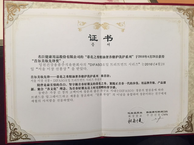 | 2016年4月28日,首尔国际化妆品美容产业博览会期间,在化妆品报社和韩国周刊新闻CMN联合主办的“中国好产品首尔峰会”上,名臣健康用品股份有限公司旗下品牌蒂花之秀精油奢养修护洗护系列荣获组委颁发的“首尔美妆先锋奖”!名臣健康用品股份有限公司总经理助理代表公司领取这项殊荣!