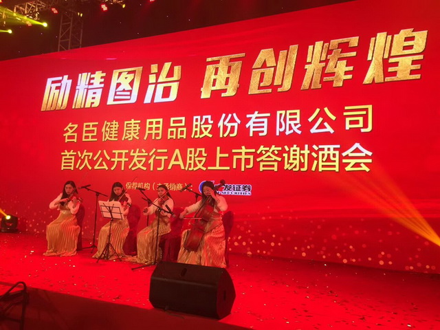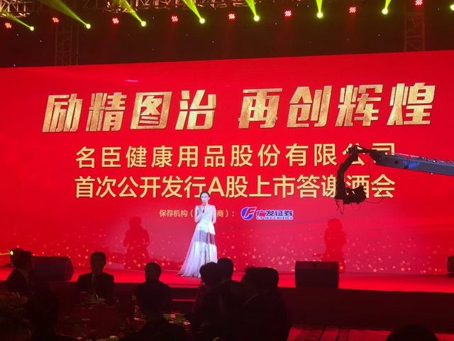 | 12月18日晚,名臣健康用品股份有限公司在深圳香格里拉大酒店隆重举行“名臣健康首次公开发行A股上市答谢酒会”。 我们深深地知道,名臣的成长和壮大,离不开社会各界的爱护和支持。有你,有感动,有你,有未来。名臣人将怀着一颗感恩的心,以本次公司成功上市作为新起点,承前启后,继往开来,开启二次创业的新征途,开拓进取,务实创新,继续坚持“团结、拼搏、务实、创新”的企业精神和“安全、健康、天然、品质”的质量理念,立足国内个人健康护理用品领域,着眼全球市场,做专做强,逐步把我们的企业,打造成为行业和消费者公认的最好的个人健康护理用品公司,打造一流科研水平、一流的品牌与品质、一流的营销渠道,以辉煌的业绩,报效各界朋友的殷殷期望。 展望未来,我们豪情壮志,充满信心!因为,无论是在过去、现在,还是将来,在我们奋进的路上,有你一路同行……