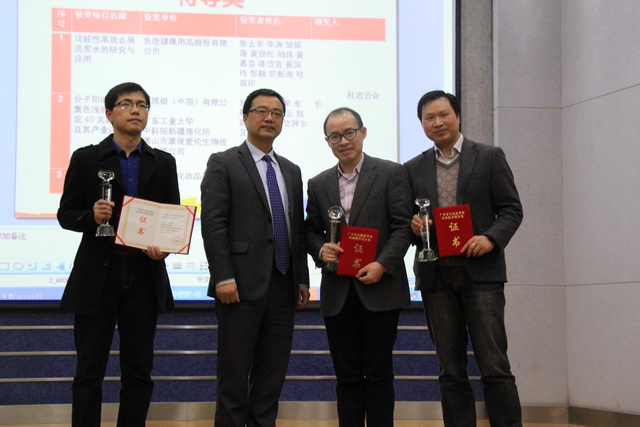 广东省化妆品学会会长杜志云教授为特等奖团队代表颁奖