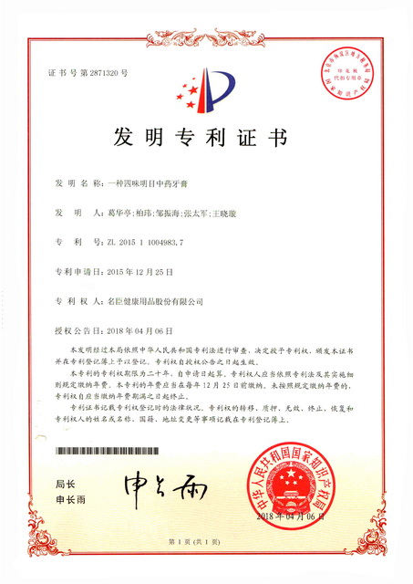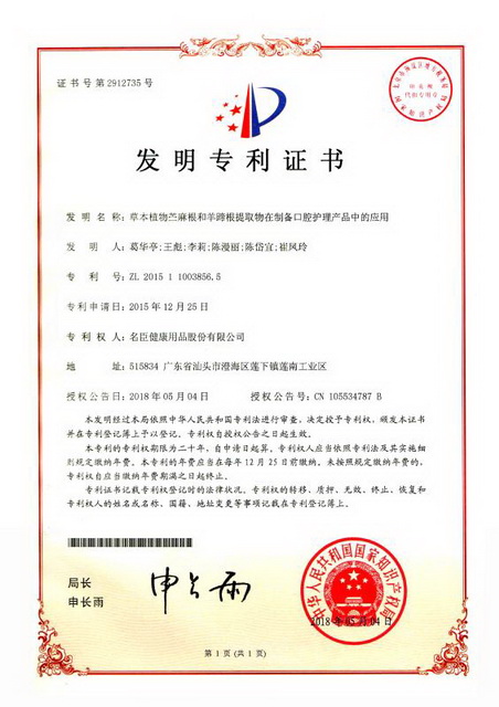 以葛华亭工程师为带头人的研发创新团队在口腔护理领域的创新成果先后获得 “一种四味明目中药牙膏”(授权发明专利号:ZL201511004983.7)和“草本植物苎麻根和羊蹄根提取物在口腔护理产品中的应用”(授权发明专利号:ZL201511003856.5)等二项发明专利授权。这二项发明专利在传统中医药成果的基础上,将传统优秀技术成果与现代科学技术相结合,为消费者提供更好的口腔护理保障。