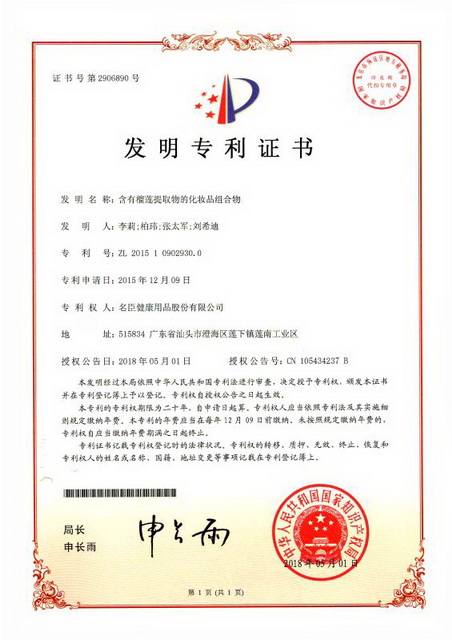 由名臣健康新生代优秀工程师李莉为带头人的创新团队,创新成果“含有榴莲提取物的化妆品组合物”(授权发明专利号:ZL201510902930.0)获得国家知识产权局发明专利授权。该成果从水果皇后榴莲中发现可对减轻皮肤色素沉积、减轻皮肤氧化应激和减少皮肤皱纹产生作用的成分,并经科学筛选和验证,发明了一种对皮肤极其有益的化妆品组合物。