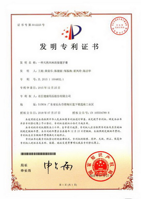 同期获得国家知识产权局发明专利授权的还有公司研发创新新秀王彪工程师主导发明的“一种天然风味的保健牙膏” (授权发明专利号:CN201511004832.1)。 据统计,今年1至8月份,名臣健康在取得以上多项技术发明专利的同时,还有8项技术发明专利进入实际审查阶段。 深深的信赖,源于卓越的品质和杰出的服务。 名臣健康将始终以科技创新作为企业持续发展的引擎,重视科技创新对产品和品牌的支撑,推动产品品质的不断提升,通过科技进步赢得消费者的信赖,将最优秀的科研成果通过产品惠及千千万万的消费者。 供稿/技术开发部李莉、张太军 |