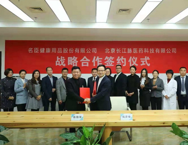 | 经过一段时间的持续接触及深度沟通、研讨,名臣健康用品股份有限公司(以下简称“名臣健康”)与北京长江脉医药科技有限责任公司(以下简称“长江脉”)签署了《战略合作框架协议》。双方于2018年10月25日在北京长江脉公司总部举行了简单而隆重的签约仪式。