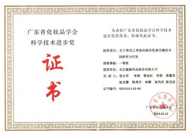 | 近日广东省化妆品学会公布了2018年化妆品科学技术进步奖获奖项目,名臣健康皮肤护理研发团队完成的“关于蒂花之秀蚕丝植语乳液关键技术的研究与开发”项目,经过专家委员严格评审,获得广东省化妆品学会科技进步奖一等奖。