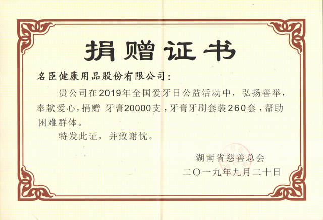 中国口腔健康科普公益联盟向湖南省慈善总会捐赠价值270万元口腔护理用品 名臣健康用品股份有限公司作为中国口腔健康科普公益联盟成员单位,派出代表参加了本次爱牙日公益活动启动仪式,并向湖南省慈善总会捐赠价值超过24万元的口腔清洁护理产品,以实际行动支持全国口腔健康科普工作,推动健康中国行动和健康口腔行动的开展。